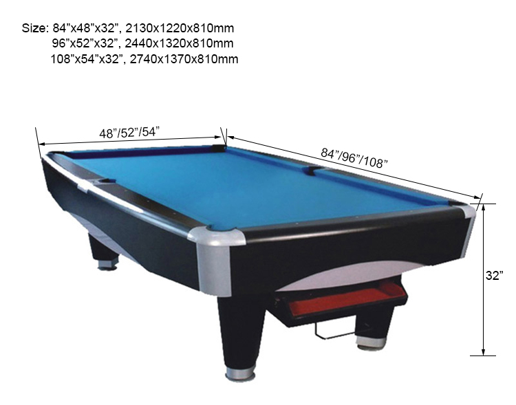 | Table Size | 7': 84”x48”x32”, 2130x1220x810mm;8': 96”x52”x32”, 2440x1320x810mm; 9':108”x54”x32”, 2740x1370x810mm. |