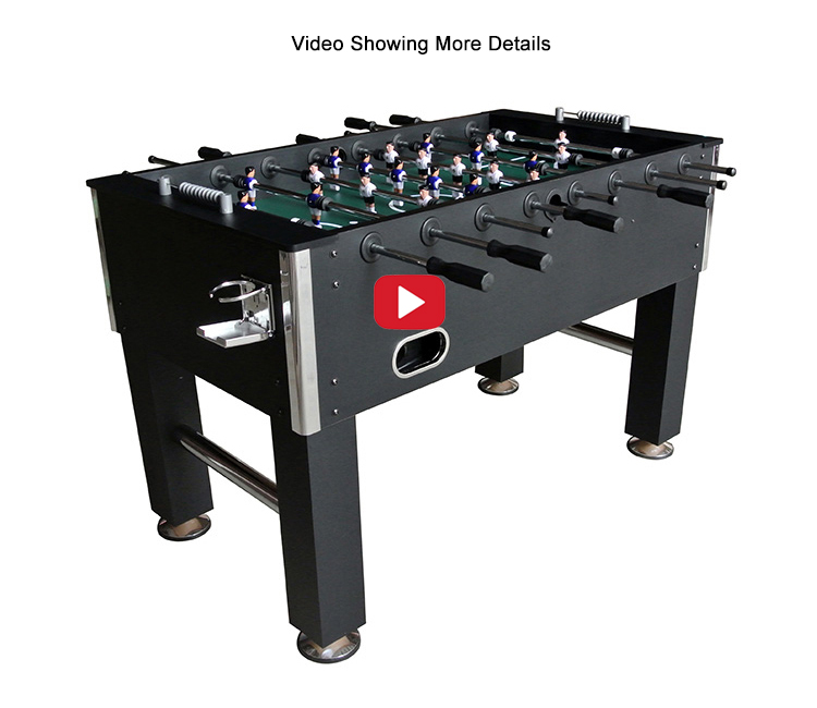 HPS-S14A is a hot selling soccer table with black body. It comes with four chromed bands on four corners. Its appearance can attract your eyesight. It has four square legs. A metal tube connect with two legs on each side. Sturdy legs make the soccer table stand steady. It’s easy to clean the surface. Its length is 54″. The size is suitable for most places. It has two plastic scorers which makes it easy handling.