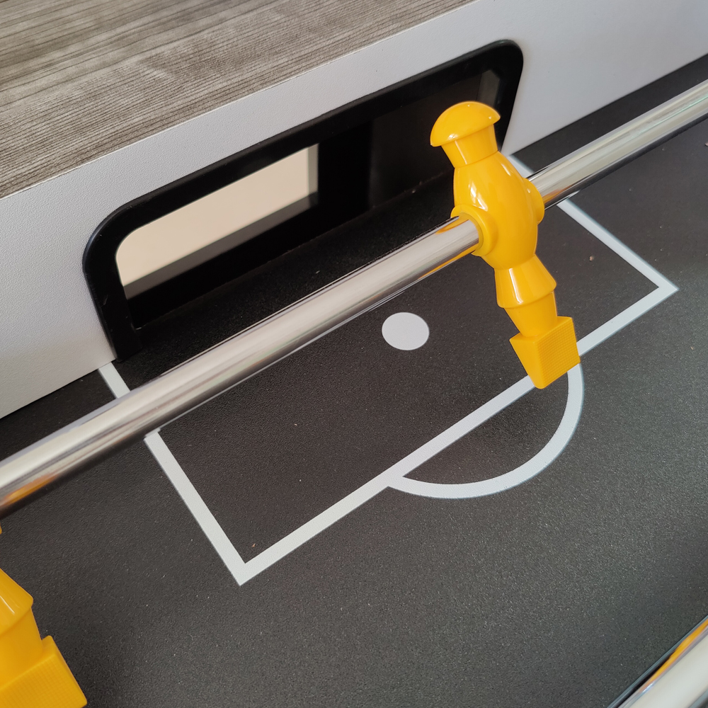 HPS-S31 is a featured soccer table with rustic finish. It’s equipped with 4 cup holders on both short sides. It brings you more convenience to place your drinks while you guys play game. The table length is 49″. The size is suitable for most places. It has two black plastic scorers on two short sides. Black and yellow players plus the rustic body finish make it look pretty elegant.